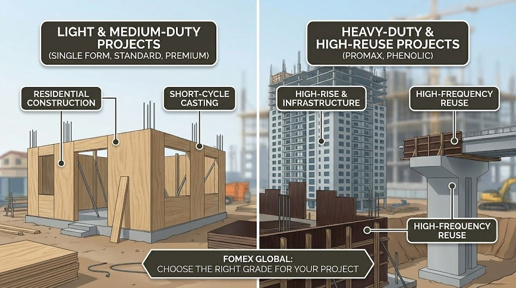 This hierarchy allows buyers to choose the most suitable panel—from Single Form for low-frequency, budget-sensitive projects to Phenolic for demanding, high-repetition formwork where failure risk must be minimized.
