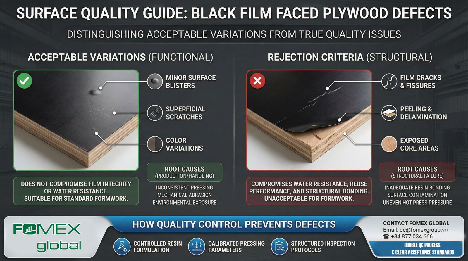 Minor surface blisters that do not penetrate the film layer may be acceptable for standard formwork applications. However, cracks that expose the core or compromise water resistance should be treated as critical defects.