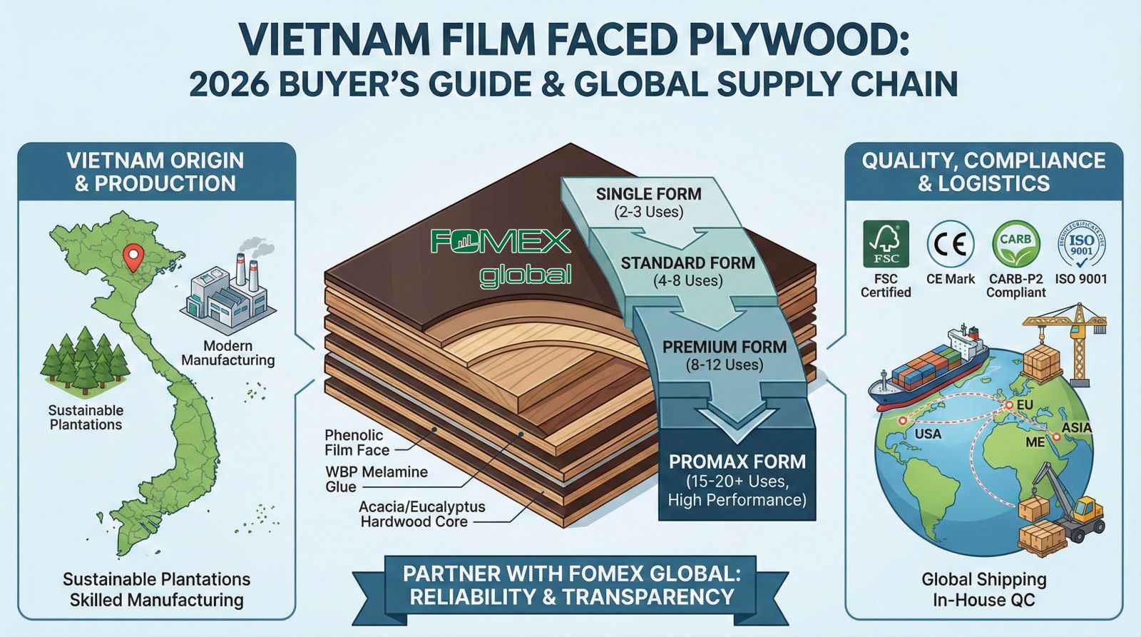 This 2026 guide explains what film faced plywood is, why Vietnam has become a key supply base, how the FOMEX GLOBAL product range is structured, and how you can work with FOMEX to reduce risk and build a long-term partnership.