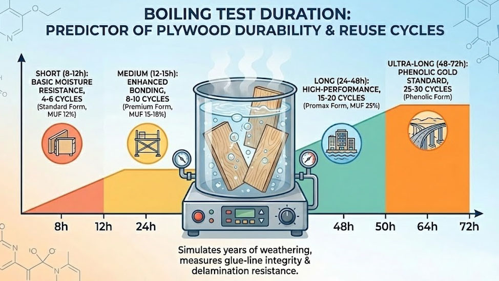 The main purpose of the boiling test is to validate how many times a plywood sheet can be reused in real conditions. While many suppliers claim high reuse cycles, only glue-line performance data accurately predicts actual lifespan.