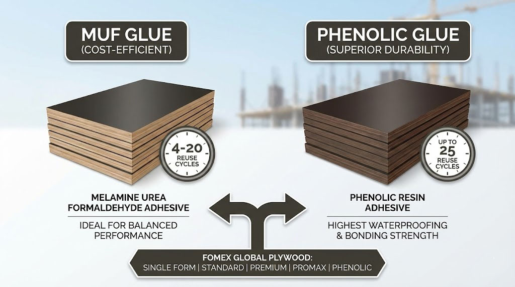 In plywood manufacturing, adhesive performance determines far more than just bonding—it defines durability, waterproofing, reuse cycles, and long-term cost efficiency. MUF (Melamine Urea Formaldehyde) and Phenolic glue dominate the construction plywood sector, especially in film faced plywood used for concrete formwork across high-demand markets such as Europe, the USA, the Middle East, and Southeast Asia.