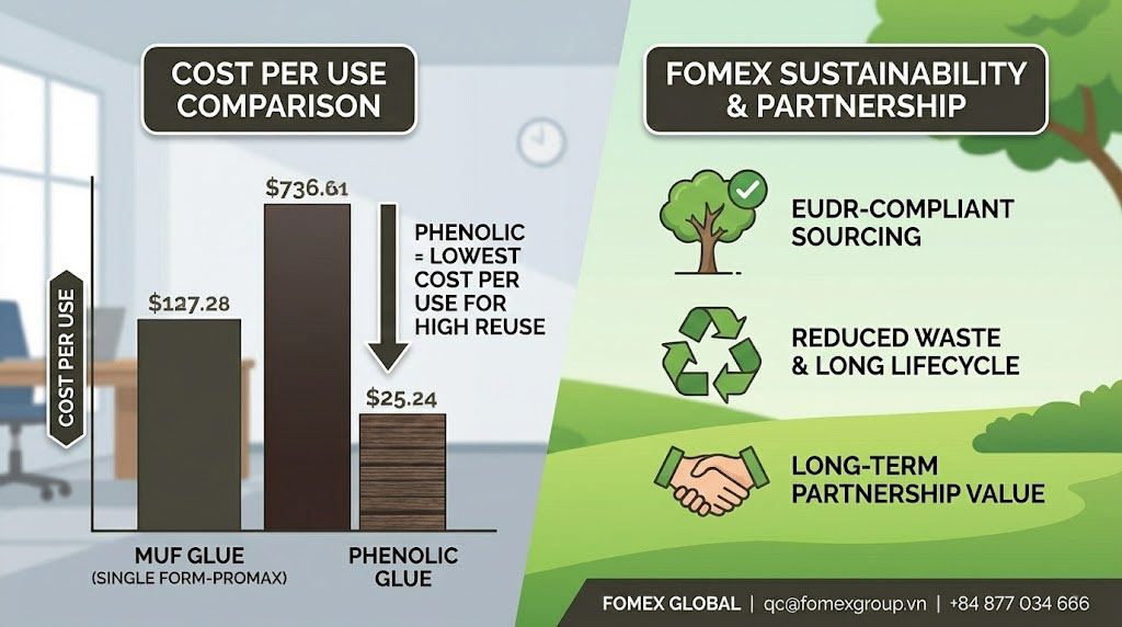 Although Phenolic plywood has a higher upfront price, it delivers the best cost-per-use value—especially for contractors purchasing container loads from Vietnam plywood exporters. MUF-based grades, meanwhile, offer step-by-step options from Single Form to Promax to match different project budgets.